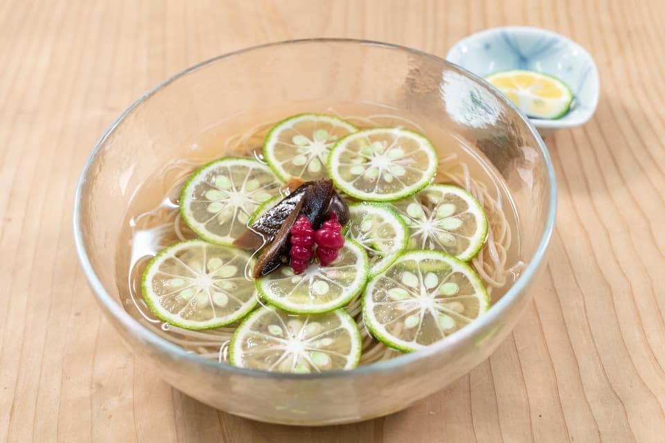 かぼすの入荷に伴い、夏の人気メニュー「かぼす蕎麦」も同時に始めました。