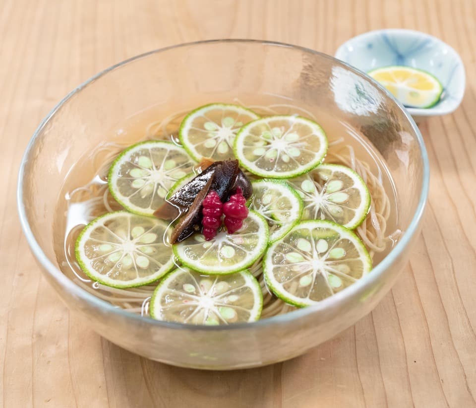 かぼすの味と香りを堪能できる、季節限定の冷たいお蕎麦になります。